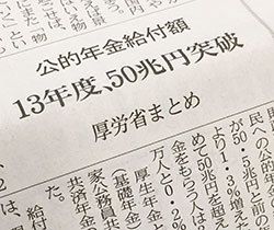 最近の日経新聞(2015年4月1日)に「公的年金給付額 13年度、50兆円突破」という小さな記事がありました。厚生年金や国民年金についての記事です(編集部注:5面左下隅、縦9cm横7cmの小スペースに載った約310字の原稿)。記事には、