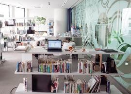 設備も非常にユニーク。朝昼晩いつでも無料の食堂のほか、スナックコーナーを各デスクから一定の距離に配置。図書室、ビリヤード台、卓球台のほか、ミニジム、ゲーム機まである。海外には自転車用通路(オランダ)、ブランコ(スイス)、オープンテラス(アメリカ)を備えるところもある。