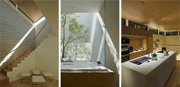 左/エントランスホールの壁にも匠の技が光る。 中/浴槽からは、庭師・比地黒義男氏が手がけた心いやされる庭を眺めることができる。 右/重厚感漂う、洗練されたキッチン。