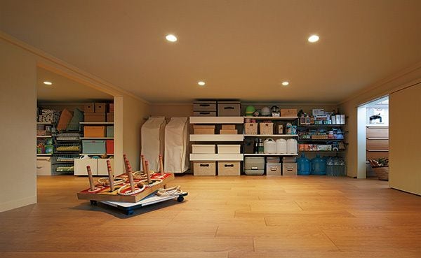 例えば、上の写真のようなリビングとつながった「蔵」なら椅子や掃除道具、子供のおもちゃなど、多様なモノがたっぷり納まり、出し入れも簡単。急な来客の際にも、散らかったモノをさっとしまうことができる。