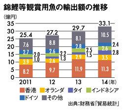 錦鯉をはじめとした観賞用魚の輸出が増えている。財務省の貿易統計によると、2014年の輸出額は前年より3.4億円増え、33.1億円。輸出先は、香港が約3割。オランダ、タイ、インドネシアと続く。特に東南アジアは近年輸出額が急増している。
