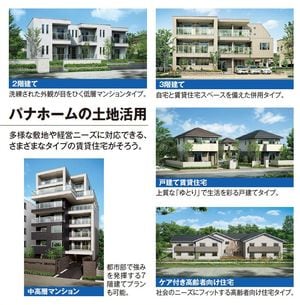 確かな技術力と柔軟な発想力を駆使してラインアップを拡大し、ときには業界初のチャレンジも成功させてきた。それが、パナホームが歩んできた歴史である。多様な土地活用の課題と向き合ってきた約40年分の経験とノウハウは、現在、写真のような商品群の中に凝縮されている。