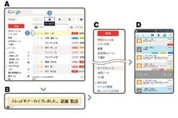【A】メールを選び(1)、ボタンを押すと(2)、受信トレイからメールが消える。
