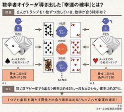 〈AとBの2人がトランプのカードをエースからキングまで13枚持ち、それぞれ1枚ずつテーブルの上に同時に出していく。2人とも同じ数だった場合、「出会い」が起きたとする。それでは、13枚すべてを出し終わっても、出会いが全く起こらない確率は何%か。また、カードの枚数を増やして「n枚」にしたら、出会いの確率は変わるのか〉
