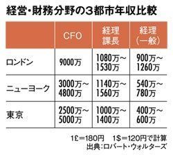 平社員では1.5倍、CFOでは3倍以上の給与の開きが、ロンドンと東京にはある。人材紹介・派遣会社のロバート・ウォルターズが、ロンドン、ニューヨーク、東京の3都市における経営・財務分野での年収を比較している。