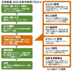 「雪の宿」「チーズアーモンド」などで知られる新潟の米菓メーカー三幸製菓だ。おせんべいに対する愛を語る「おせんべい採用」、新潟出身者以外が新潟好きをアピールする「ニイガタ採用」。勉強一筋の学生向けの「ガリ勉採用」、最終面接まで一度も会わず、スカイプで面接をする「遠距離就活」。三幸製菓が打ち出したのは、これらのユニークな選考方法から自分に合った方法を選び応募してもらう、その名も「カフェテリア採用」だ。