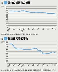 結婚や住宅購入は、クロスセリングによる家具小売りの回転率向上の大きな機会である。しかし少子高齢化の進む日本では、2000年以降には婚姻数も新設住宅着工件数も減少していく(図4、5)。