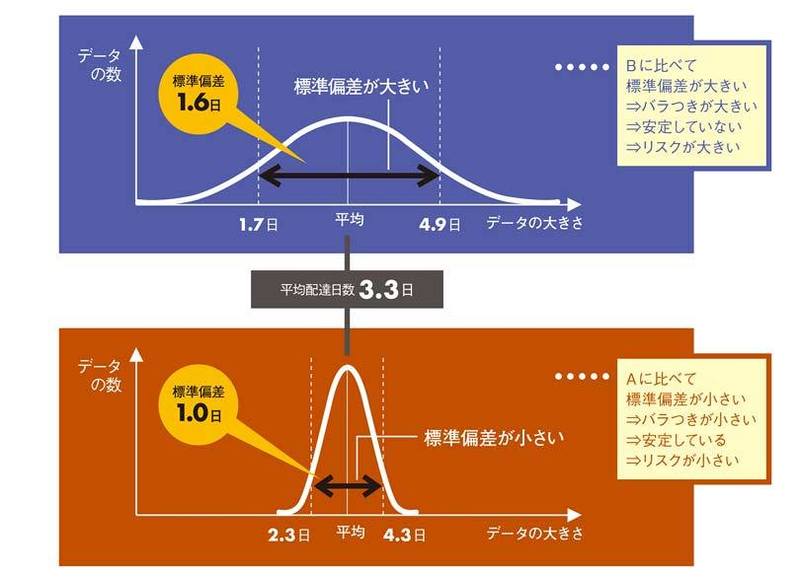 「御社には売れ筋商品を供給していただいているだけに、弊社にとって在庫切れは致命的なのです。だから『配達遅延のリスク』をあらかじめ把握しておきたい。でも実際どのくらい配達にバラつきがあるのか、それをどうやったら求められるのかよくわからないのです。お恥ずかしいのですが、調べてみたところ、なんでも、データのバラつきなら『標準偏差』を求めればわかると」。さらに続けます。