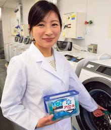 渡部真季氏は、日本の消費者理解や試作品の評価試験を担当する研究者として、この日本向けジェルボール型洗剤の開発に、プロジェクト発足時の09年から携わっている。「実は、ヨーロッパでは01年頃から発売されていました。しかし、日本とは洗濯条件や習慣が異なるため、日本でそのまま販売するわけにはいかなかったのです。ヨーロッパの洗濯の洗いは約40度で1時間以上。日本は、洗いだけなら水で10分以内。さらに湿度が高い日本での汗臭さや染み、生乾きの臭いにも対応しないといけなかったんです」。