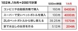 さらに手をかけて、家でお茶を煎れることを計算してみましょう。水道料金は自治体によって変わってきますから東京都を例に採りますと、1Lの水道代は0.24円になります。水出し用の麦茶パックを使えば1L分が約10円ですので、合計で10.24円、500mlですと5.12円となります。5.12円を2本持っていくと考えると、1カ月で204円になるのです。