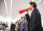 発言の際は、どうしても声が小さくなりがち。メガホンは東会長の発案で赤と青が使われている。