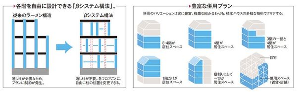 「ベレオ・プラス」の最大の特長は「自由度の高い設計システム」にある。一般的な重量鉄骨の場合、下階から上階に伸びる通し柱が必要となるが、積水ハウス独自の構造である「βシステム構法」なら、通し柱が不要。各フロアごとに、自由に柱の位置を変更できるため、二世帯住宅ならそれぞれの家族に適した間取りに、賃貸住宅なら入居者のニーズに応えた空間にすることができる。