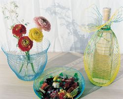これは、直径20センチほどの1枚の円形紙を網状に精密加工し、外周をつかんで引っ張り上げたり、伸ばすと空気を包み込むように自由な形を作ることができる。インテリアとしてだけでなく、ワインボトルなどビンのラッピングにも使える。紙の表と裏で色が違うため、見る角度によって色彩も変化して、目を楽しませてくれる。これは、まさに同社の型抜きの技術があって生まれた物だ。山田は「型の製作と抜きには苦労しました」と語る。