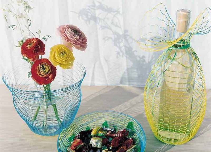 これは、直径20センチほどの1枚の円形紙を網状に精密加工し、外周をつかんで引っ張り上げたり、伸ばすと空気を包み込むように自由な形を作ることができる。インテリアとしてだけでなく、ワインボトルなどビンのラッピングにも使える。紙の表と裏で色が違うため、見る角度によって色彩も変化して、目を楽しませてくれる。これは、まさに同社の型抜きの技術があって生まれた物だ。山田は「型の製作と抜きには苦労しました」と語る。