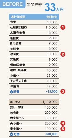 (3)営業職のため飲み会など交際費のあふれ、小遣いでは収まらない分や日々の細かな使途不明金がかさみ、毎月赤字。ボーナスからの補てん分が年間18万に。