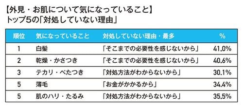 「あなたがご自身の外見・お肌について、気になっていることは?」という質問に、「白髪」(24.5%)、「乾燥・かさつき」(23.1%)、「テカリ・べたつき」(21.3%)、「薄毛」(19.5%)、「肌のハリ・たるみ」(19.0%)をトップ5に、「フケ・かゆみ」「頭皮が脂っぽい」「髪の質・ダメージ」など、多様な項目が並んだ。
