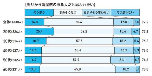 さらに同調査では、身だしなみの中でも、特に「清潔感」を重視している傾向も明らかとなった。「周りから清潔感のある人だと思われたい」と思う男性の割合は、20代から60代まで、全年代で7割以上(図1)。誰もが自分の「清潔度」に対して敏感であるということは、裏を返せば、「他人の清潔度も注意深くチェックしている」と受け止めるべきだろう。