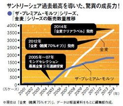 「金麦」が絶好調である。14年には前年比で109%、300万ケースの販売数増という脅威の伸びを記録した。これにより、縮小する市場で、過去最高のシェアを更新した。