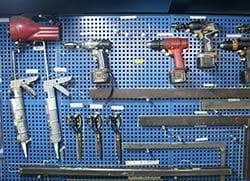 工場内にあるすべての工具、文具、消耗品、清掃道具などは5頓によって整頓されている。例えば、共有工具を整頓しておくボードには工具が並べられているだけでなく、同じ位置と方向に戻すように輪郭をなぞった姿絵がある。工具には名前を表示し、戻す場所には標識がある。工具を使っているときは、使用者の名札をその場所に貼っておく。