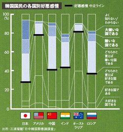 私は外務省の助成を受けて、2014年11月から12月にかけ、日本・中国・韓国の3カ国で国際意識調査を実施しました。調査によれば、日本を「大嫌い」「嫌い」とした割合が最も高い国は韓国、次いで中国です。