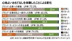 ブランドに対する顧客の愛着度(ロイヤルティ)を示す指標で、数値が高いほどブランドとの結びつきが高い。これまでの調査によって、FRIの数値が高い企業ほど、業績がよいばかりか、成長性も高いという相関関係も明らかになっている。そして、おもてなしがFRIの向上に有効なことも調査でわかっている。図のように、心地よいおもてなしを受けた顧客のうち、約4分の3がブランドに対する愛着度、信頼度が高まったと回答しているのだ。