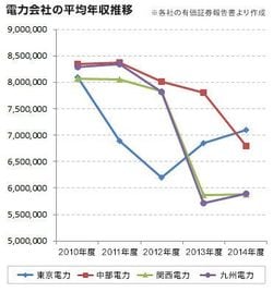 収益の黒字化が理由のようですが、赤字が続く関西電力と九州電力は、賞与カットなどにより、震災前に比べて平均200万円以上の年収減となったままです。ついに2014年度には、4社の中で東電が最高の平均年収(709万円)となっています。
