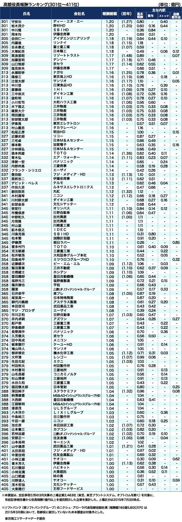 最新給料ランキング2015年 #年収・給料 2015/09/02 8:00 #1 「高額役員報酬ランキング」411人の実名公開! PRESIDENT Online 鎌田 正文 +フォロー ビジネスリサーチ・ジャパン代表 前ページ 1 2 3 4 5 【関連記事】 「クビになりやすい業種・会社」ランキング100 法科大学院全74校「司法試験」合格ランキング ホワイト企業志向! 2015年就職人気企業ランキング100 億万長者続出!? 社長の給料はどうやって決まるのか? 10億続出!報酬基準「役員だけ見える化しない」カラクリ 1 2 3 4 5 鎌田 正文(かまた・まさふみ) ビジネスリサーチ・ジャパン代表 1995年、ビジネスリサーチ・ジャパン設立。金融・流通・メーカーなどの各分野から経済全般まで、幅広く取材、執筆。『2012年版 図解 これから伸びる企業が面白いほどわかる本』など、業界研究の著作多数。 <この著者の他の記事> なぜ三菱商事の平均年収は380万円も上がったのか…平均年収が高い「全国トップ500社」ランキング2023【2024上半期BEST5】 X 関連記事 「クビになりやすい業種・会社」ランキング100 法科大学院全74校「司法試験」合格ランキング ホワイト企業志向! 2015年就職人気企業ランキング100 ランキング 1位 やっぱり高市首相の戦略は正しかった…創価学会票を当てにしたのに「小選挙区で一人負け」立憲議員の大誤算 ランキングをもっと見る ビジネス #年収・給料