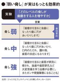「歯を磨く習慣を啓蒙するために、どんな表現が効果的か」を調べる実験がある。脅し(警告)のレベルを「弱・中・強」として反応を見ると、もっとも歯磨き習慣が定着したのは弱い脅しのケースだった。(表を参照)