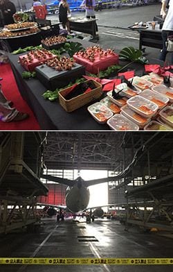 TEDxHanedaのアフターパーティではアルコールや機内食を含む料理の提供も。突然、シャッターが開き、飛行機の向こう側に夕焼け空が!