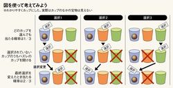 最後に残った2つの扉。ここで彼はささやく。「もう1つの扉に変えてもいいですよ」と。もし、そこであなたが「確率は2分の1だから、どっちを選んでも同じだろう」と考えたとすれば、それは早計だ。選択を変えたほうが当たる可能性は高くなるからである。どういうことか、3つのカップを使って説明しよう(図参照)。