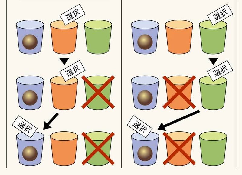 最後に残った2つの扉。ここで彼はささやく。「もう1つの扉に変えてもいいですよ」と。もし、そこであなたが「確率は2分の1だから、どっちを選んでも同じだろう」と考えたとすれば、それは早計だ。選択を変えたほうが当たる可能性は高くなるからである。どういうことか、3つのカップを使って説明しよう(図参照)。