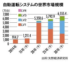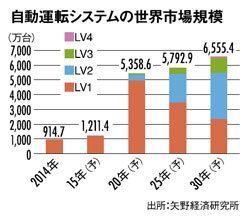 自動運転には4段階の基準がある。加速・操舵・制動のうち、1つを自動化するレベル1。2つを自動化するレベル2。人が運転する時間と車に運転を任せる時間がある「半自動運転」がレベル3。レベル4は車に運転を任せる「完全自動運転」だ。30年に4000万台を超えると見られるのは、レベル2、3の合計。レベル2は、高速道路における渋滞時の低速追従走行などの形ですでに広がり始めている。レベル3は、米国市場を中心に18年頃に実用化される見込みだ。