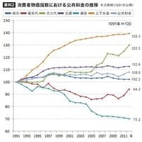 また、こうしたのうち公共料金について、ここ10年程度の推移を見ると、通信費よりも大きな伸びを示しているものばかりだ〔資料2〕。