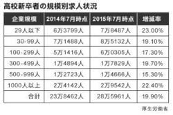 ところが、冒頭に述べた、求人倍率の改善。表は、高校新卒者の企業規模別求人数ですが、1000人以上の大企業でも、前年比20%以上の上昇を示しています。求職者総数が18万6000人ですので、単純に見れば、6人に1人は大企業に入社できることになります。成績が比較的優秀で、学力的には大学進学が可能な学生に絞れば、より確率はアップするでしょう。