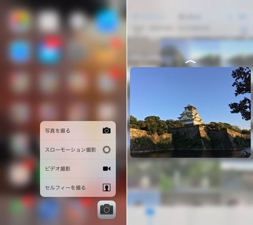 iPhone 6/6s Plusはそれに加えて3次元の方向、つまり「押す強さ」を感知できるようにしたのだ。といっても微妙な強さのコントロールは難しいので「強く押す(Peek)/もっと強く押す(Pop)」の2段階に絞っている。ホーム画面では強く押すとサブメニューが出てきたり(使い勝手としては、マウスの右クリックのような感覚)、写真アプリでは「強く押す」と写真がにゅっと大きく表示され、「もっと強く押す」とその写真の拡大表示に切り替わる。メールを見る時も、「強く押す」ことでメールの概要をさっとチェックできるので、いちいちきちんと開かなくていい。