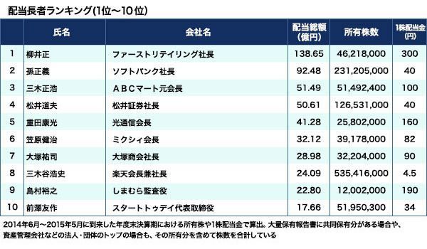 配当長者日本一は、ファーストリテイリングの柳井正社長だ。同社の14年8月期の1株配当金は300円。柳井社長は、個人名義と共同保有分を合計すると同社の株式を4621万8000株所有しており、配当金は138億6540万円だった計算になる。15年8月期の1株配当金は350円を予定しており、所有株に変動がなければ、配当金は161億円を超す。