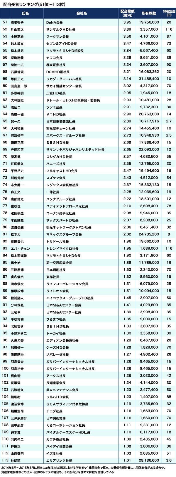 #配当 #年収・給料 2015/10/22 8:30 「配当長者ランキング」役員報酬だけでは分からない大金持ち経営者113人 PRESIDENT Online 鎌田 正文 +フォロー ビジネスリサーチ・ジャパン代表 前ページ 1 2 3 4 5 【関連記事】 「高額役員報酬ランキング」411人の実名公開! 優待名人・桐谷さん&ビジネスマン1000人が選んだ「株主優待」ベスト100 「クビになりやすい業種・会社」ランキング100 ホワイト企業志向! 2015年就職人気企業ランキング100 これから「どんどん年収が上がる」職種&業種ベスト7 1 2 3 4 5 鎌田 正文(かまた・まさふみ) ビジネスリサーチ・ジャパン代表 1995年、ビジネスリサーチ・ジャパン設立。金融・流通・メーカーなどの各分野から経済全般まで、幅広く取材、執筆。『2012年版 図解 これから伸びる企業が面白いほどわかる本』など、業界研究の著作多数。 <この著者の他の記事> なぜ三菱商事の平均年収は380万円も上がったのか…平均年収が高い「全国トップ500社」ランキング2023【2024上半期BEST5】 X 関連記事 「高額役員報酬ランキング」411人の実名公開! 優待名人・桐谷さん&ビジネスマン1000人が選んだ「株主優待」ベスト100 「クビになりやすい業種・会社」ランキング100 ランキング 1位 1回10分・室内でもできる…整形外科医が「姿勢も血流もよくなる」と勧める"肋骨ウォーキング"の効果【2026年1月BEST】 ランキングをもっと見る ビジネス #配当 #年収・給料 #役員 #ファーストリテイリング #ソフトバンク #任天堂 #ABCマート #松井証券 #光通信 #大塚商会 #楽天 #しまむら #スタートトゥデイ #サンドラッグ #パーク24 #ニトリ #第一興商 #セブンアンドアイ #セブンイレブン