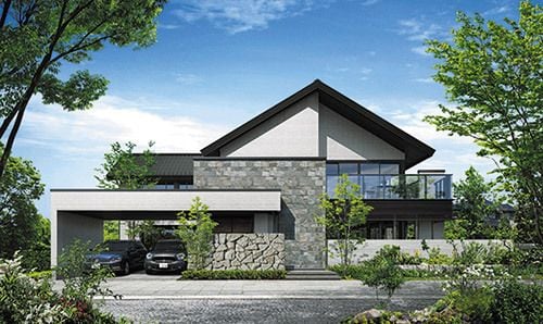 6寸勾配の切妻屋根に石造りの壁やガラスバルコニーがモダンな佇まいを生み出す。