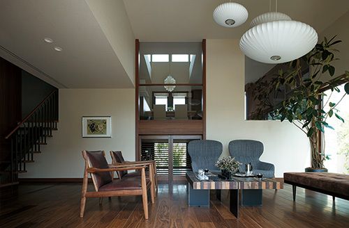 大空間の1階リビングと1.5階のDK、さらに吹き抜けを介して2階までが立体的につながる。1人掛け椅子の背後はガラリを通して自然の風が吹き抜ける、大収納空間「蔵」。