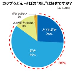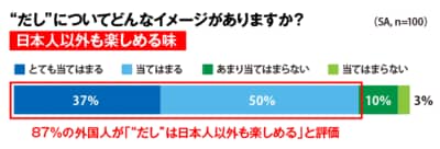 対象は、欧米系の日本在住者100人。カップうどん・そばを過去3カ月以内に食べたことがあり、“だし”を知っている人である。まず、「和食が好き」と答えた人の比率はなんと98%。もっとも好きな料理を問うと、ここでも和食はトップで26%。つまり4人に1人。この数値は「母国の料理が好き」の17%を超えてしまったのだ。また、「“だし”は和食の代名詞」と考える人が88%。他のインスタント麺と比べてカップうどん・そばが好きな理由は何かとの問いに「“だし”が美味しいから」と回答した人は85%にも及んだのだ。