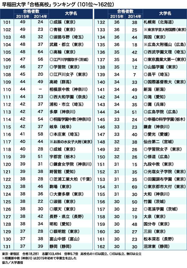 2016年「間違いだらけの大学選び」 #大学 #受験 2015/11/24 10:00 #1 #2 #3 志願者10万人「早大合格ランキング」強い中高一貫校と逆襲する公立校 PRESIDENT Online 安田 賢治 +フォロー 大学通信 常務取締役 前ページ 1 2 3 4 (宇佐見利明=撮影) 【関連記事】 「志願者数ランキング」近畿大2年連続トップ! 明大、早大が絶対勝てない理由 法科大学院全74校「司法試験」合格ランキング 「クビになりやすい業種・会社」ランキング100 ホワイト企業志向! 2015年就職人気企業ランキング100 「年収ランキング」給料が高い会社ベスト500 1 2 3 4 安田 賢治(やすだ・けんじ) 大学通信 常務取締役 早稲田大学政治経済学部卒業後、大学通信入社。中学受験から大学受験まで教育関連の情報を発信している。 <この著者の他の記事> え!2021年開始の"大学入学共通テスト"は、ほぼセンターと変わらないの!? 関連記事 「志願者数ランキング」近畿大2年連続トップ! 明大、早大が絶対勝てない理由 法科大学院全74校「司法試験」合格ランキング 「クビになりやすい業種・会社」ランキング100 ランキング 1位 1回10分・室内でもできる…整形外科医が「姿勢も血流もよくなる」と勧める"肋骨ウォーキング"の効果【2026年1月BEST】 ランキングをもっと見る キャリア #大学 #受験 #早稲田大学 #開成学園 #中高一貫校