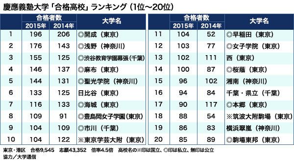 その慶應義塾大の高校別合格者ランキングトップは2年連続で開成となり、196人だった。2位が浅野の176人で。1位、2位は昨年と同じ顔ぶれだ。3位は6位から躍進した渋谷教育学園幕張の155人、以下、麻布、聖光学院、日比谷、海城と続いた。8位の豊島岡女子学園は昨年の17位からの躍進だ。今年は豊島岡女子学園がトップ10に入り、昨年はトップ10にゼロだった女子校が入ったことになる。この他でも今年は女子校の躍進が目立った。昨年の25位から12位に躍進した女子学院。同じく昨年の19位から14位に伸びた桜蔭などだ。