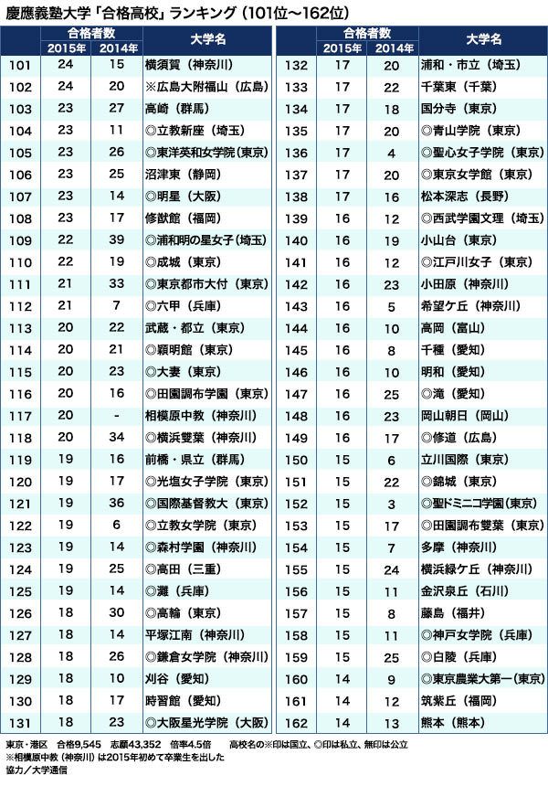 2016年「間違いだらけの大学選び」 #慶應義塾大学 #受験 2015/12/07 8:00 #1 #2 #3 「慶大合格ランキング」開成196人トップ! 男子校が上位独占も、女子校が大健闘 PRESIDENT Online 安田 賢治 +フォロー 大学通信 常務取締役 前ページ 1 2 3 4 (宇佐見利明=撮影) 【関連記事】 志願者10万人「早大合格ランキング」強い中高一貫校と逆襲する公立校 「志願者数ランキング」近畿大2年連続トップ! 明大、早大が絶対勝てない理由 「年収ランキング」給料が高い会社ベスト500 優待名人・桐谷さん&ビジネスマン1000人が選んだ「株主優待」ベスト100 全74校「司法試験」合格ランキング2015 1 2 3 4 安田 賢治(やすだ・けんじ) 大学通信 常務取締役 早稲田大学政治経済学部卒業後、大学通信入社。中学受験から大学受験まで教育関連の情報を発信している。 <この著者の他の記事> え!2021年開始の"大学入学共通テスト"は、ほぼセンターと変わらないの!? 関連記事 志願者10万人「早大合格ランキング」強い中高一貫校と逆襲する公立校 「志願者数ランキング」近畿大2年連続トップ! 明大、早大が絶対勝てない理由 「年収ランキング」給料が高い会社ベスト500 ランキング 1位 1回10分・室内でもできる…整形外科医が「姿勢も血流もよくなる」と勧める"肋骨ウォーキング"の効果【2026年1月BEST】 ランキングをもっと見る ライフ #慶應義塾大学 #受験 #中高一貫校 #開成学園