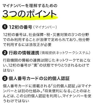 さてここからは改めて、楠氏にマイナンバーの「仕組み」について聞いていこう。繰り返しになるが、マイナンバーを理解するためのポイントは(1)12桁の番号、(2)情報連携、(3)公的個人認証、の3つであると楠氏は説明する。