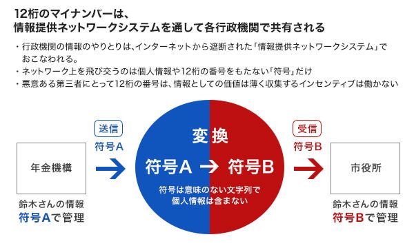 「符号」は、単なる文字列であり、それ単体では個人を特定できる情報を含まない。情報の照会先の機関も同じく「符号」を使って個人情報を管理している。ただし、その符号は、照会元の機関のものとは異なる。情報提供ネットワークシステムは、双方の異なる「符号」を変換する仕組みを備えている。つまり、ネットワークの中を飛び交うのは、各行政機関で独自に付番された異なる「符号」だけであり、“素”のマイナンバーのやり取りは行われないという仕組みなのだ。
