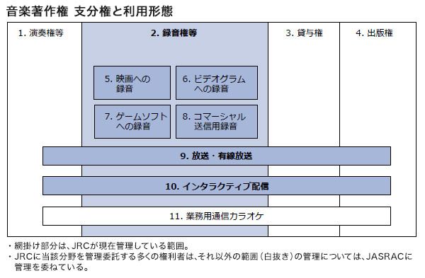 ※この区分はJASRACが管理事業法への移行の際、契約約款で示したもの。新規参入事業者もこの区分を踏襲している