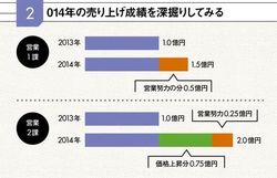 たとえば次のケースを考えてみてほしい。「あなたが課長を務める営業1課と、別な人が課長を務める営業2課は同じ製品を取り扱って、2013年度に1億円ずつ売り上げた。14年度に入って1課は同じ製品をそのまま継続して販売し、売上高を50%増やした。一方の営業2課は戦略を変え、1.6倍の単価の別の製品で売上高を2倍にした。あなたの上司である部長は14年度の1.5億円と2.0億円という2つの数字を見て、営業2課を評価している様子だ。この評価は本当に正しいのだろうか?」。