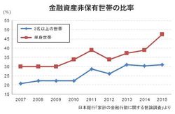 本題から少し脱線するが、日本で最も裕福な50名の合計資産総額は2014年度には約17兆円、ここ数年毎年1割前後増えている。一方、日銀によると金融資産(不動産は除く)ゼロの世帯がここ数年で急増、直近の調査では2名以上世帯の30.9%、単身世帯の47.6%になっている。(図参照)