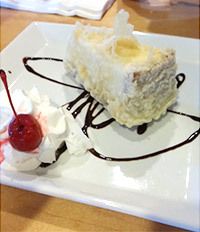 アメリカの日本食レストランのデザート・メニューにあった「チーズケーキの天ぷら」。チーズケーキを油で揚げる発想には唖然。通常の2個分の巨大な物体に添えてあるクリームは植物性“ホイップクリーム”。甘すぎて、植物性か動物性か、判断に困るほど。