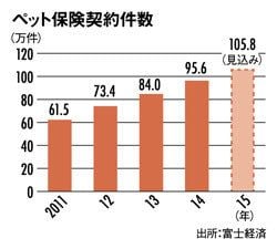 ペット保険の契約件数が急増している。富士経済の調べによると、2015年には105万8000件に到達する見込みだ。11年からの4年間で72%増えている計算になる。